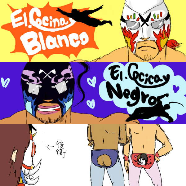 サイズ大きいです 漫画です チューにあたって、ちゃんとレドさんに許可は頂いておりますのでご安心ください(笑)。 以前フォウトさんのオフ会でお会いしたときのご縁で、レドさんと闘技大会に参加しました! これがまーしゃるさんというのか…駄無二匹がお世話になりました。 折角だからルチャチーム組まね?ということになり、 マツリさんそっちのけでルチャの設定をもりもり決めていました。 チーム名が「Peligrosas cocineros(ペリグロソ コスィネロス)」で、意味は「危険な調理人」 レドさんがスペイン語をいろいろ調べてくださり、プリキュアのノリで(嘘)リングネームも考えていただいちゃいました! レドさん=エル・コスィーナ・ネグロ ロホ=エル・コスィーナ・ブランコ エル=男性名詞単数形につく定冠詞(ザ、みたいな) コスィーナ=料理人 ネグロ、ブランカ=黒、白 です。 ヘッヘッヘうれしい 嫁さんは自分が適当に「あずきジャージ」とか言ったらあずきジャージのマネージャーになりました。ゴメン。 ちなみに登場絵はこちら↓ ちなみにマスクデザインなんですが。 レドさんが鍋で煮込んでて、ロホが炒め物しています。……だせえ!ほっとけ! PR